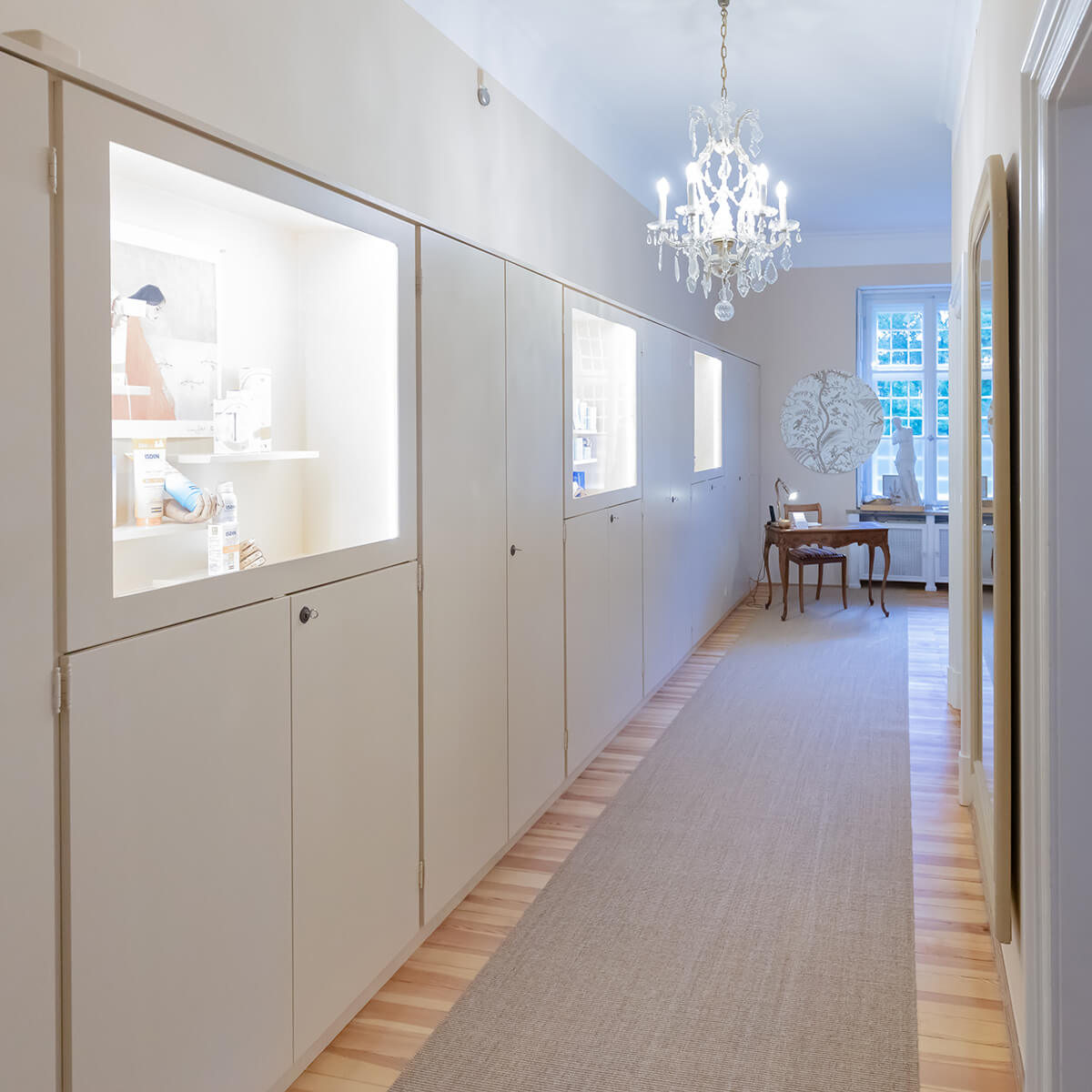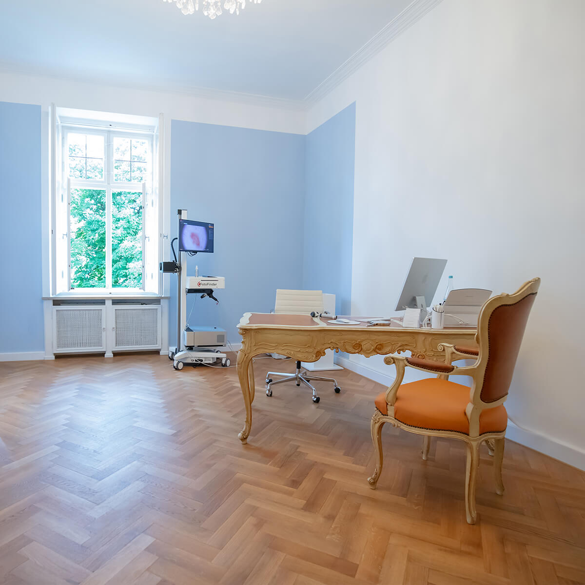 Unsere Praxis umfasst einen ansprechenden Wartebereich, verschiedene Sprechzimmer für die persönliche Beratung und diskrete Behandlung sowie mehrere Eingriffsräume, ausgestattet mit innovativen Lasersystemen und Radiofrequenzgeräten.